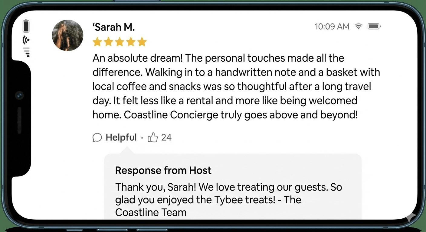 At Coastline Concierge, we handle the guest experience from start to finish. We ensure that every guest walks into a home that feels like a luxury hotel, complete with the personal touches that drive revenue.